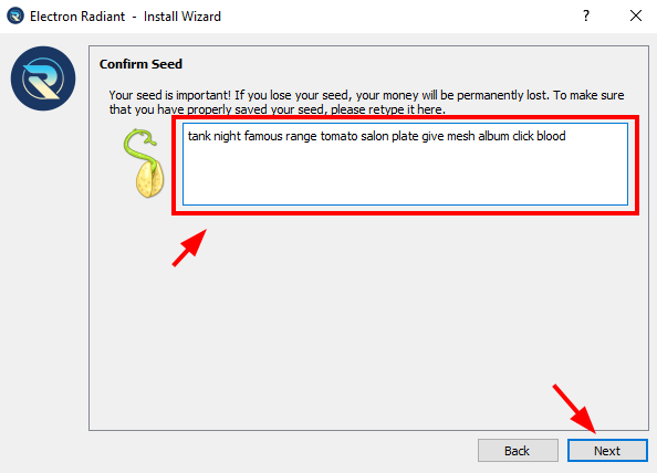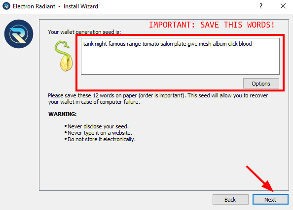 Kata-kata yang muncul akan menjadi benih portofolio baru. Perlu dan wajib untuk menuliskannya atau menyalinnya ke file. Jika hilang, Anda akan kehilangan akses ke setiap radiant di portofolio alamat.