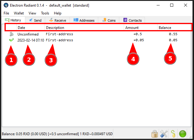 Di sini Anda dapat melihat semua transaksi yang diterima dan tidak dibelanjakan.