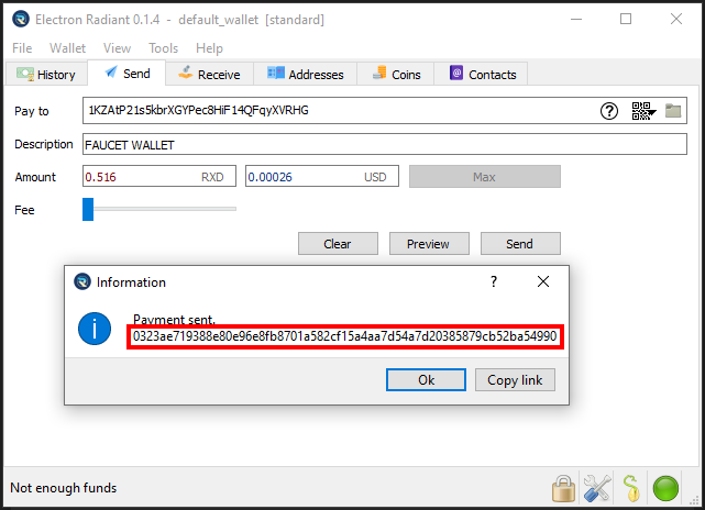 Pada history muncul transaksi ini seperti terlihat pada gambar dan transaksi akan muncul pada blok berikutnya yang dihasilkan (sekitar 5 menit).